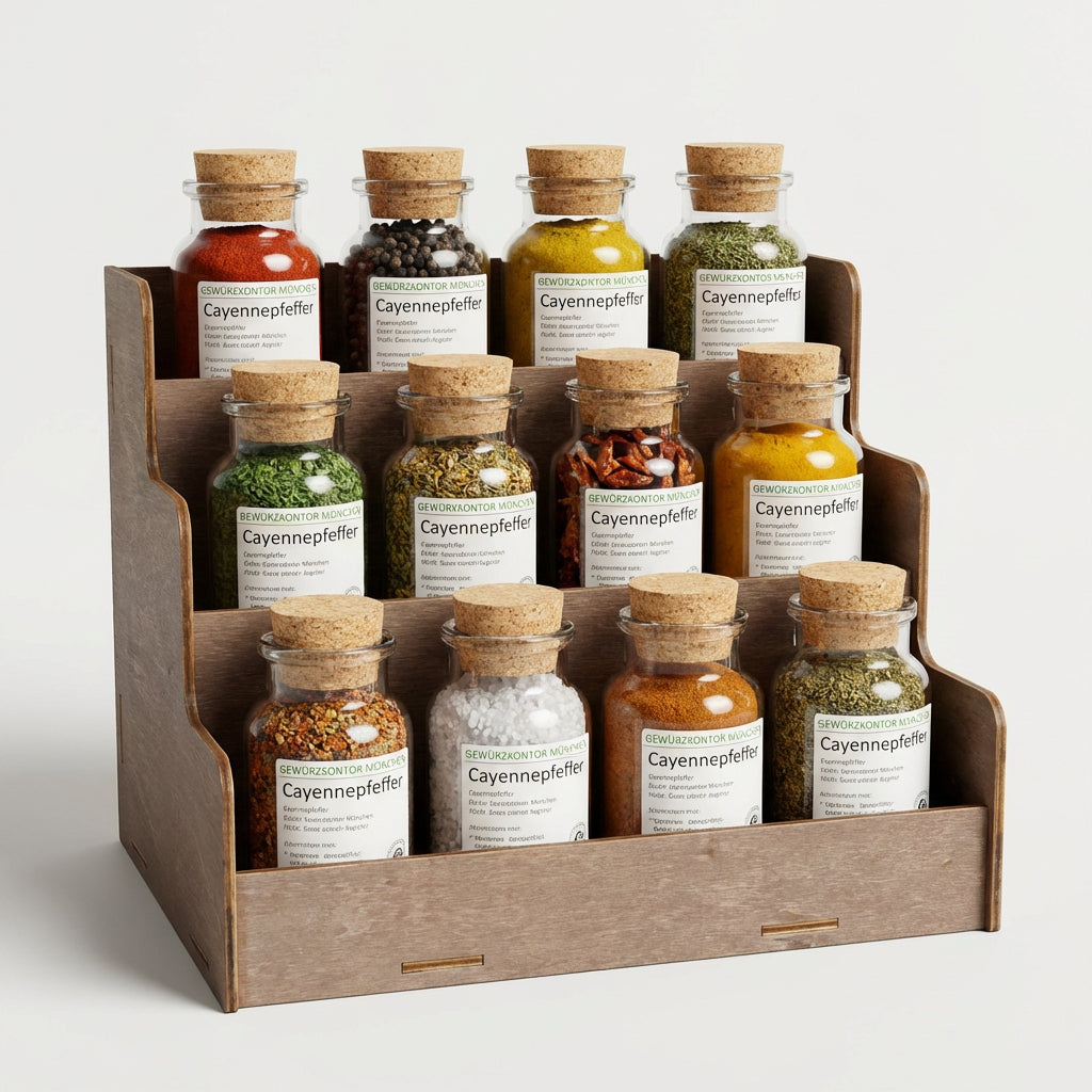Eleganter Aufsteller für Ihre Gewürzkollektion im angesagten Holz-Design. Die stabile Konstruktion bietet Platz für mehrere Gewürzgläser und Beutel, während das hochwertige Finish perfekt in jede moderne Küche passt. Ideal zur Aufbewahrung und gleichzeitigen Präsentation Ihrer Lieblingswürzmischungen. Der Premium-Look verleiht Ihrem Gewürzregal einen professionellen Touch und macht Ihre Küche zur Schatzkammer feiner Aromen.